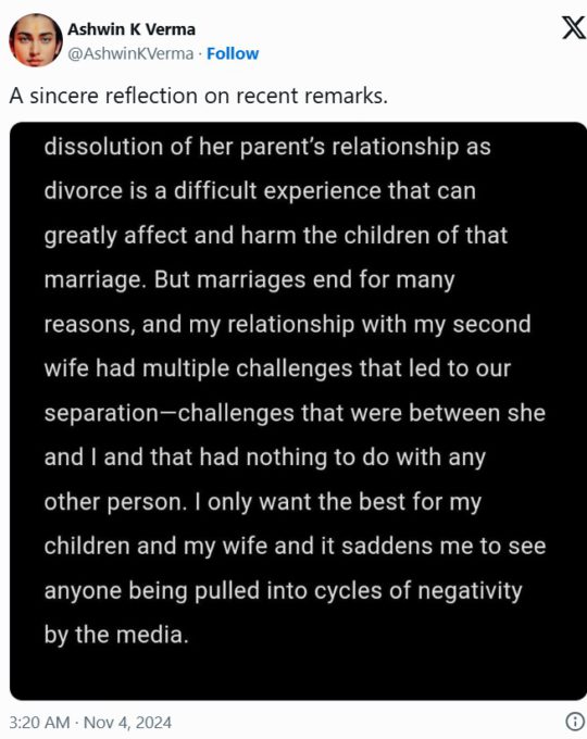 हालांकि इस पोस्ट को लेकर रुपाली गांगुली का कोई रिएक्शन नहीं आया है. लेकिन अश्विन वर्मा ने अपनी बेटी को लेकर सफाई दी है. रुपाली गांगुली के पति ने सोशल मीडिया पर एक नोट शेयर किया है, एक्स पर रुपाली गांगुली के पति ने लिखा, मेरे पिछले रिश्तों से दो बेटियां हैं, रुपाली और मैं इस बारे में हमेशा बात करते हैं कि मैं इसकी बहुत परवाह करता हूं. मैं समझता हूं कि मेरी छोटी बेटी अभी भी बहुत दुखी रहती है.अपने मातापिता के रिश्ते के टूटने से वह दुखी हैं क्योंकि तलाक एक कठिन अनुभव है, जो उस शादी के बाद बच्चों को बहुत प्रभावित करता है और नुकसान पहुंचा सकता है.’